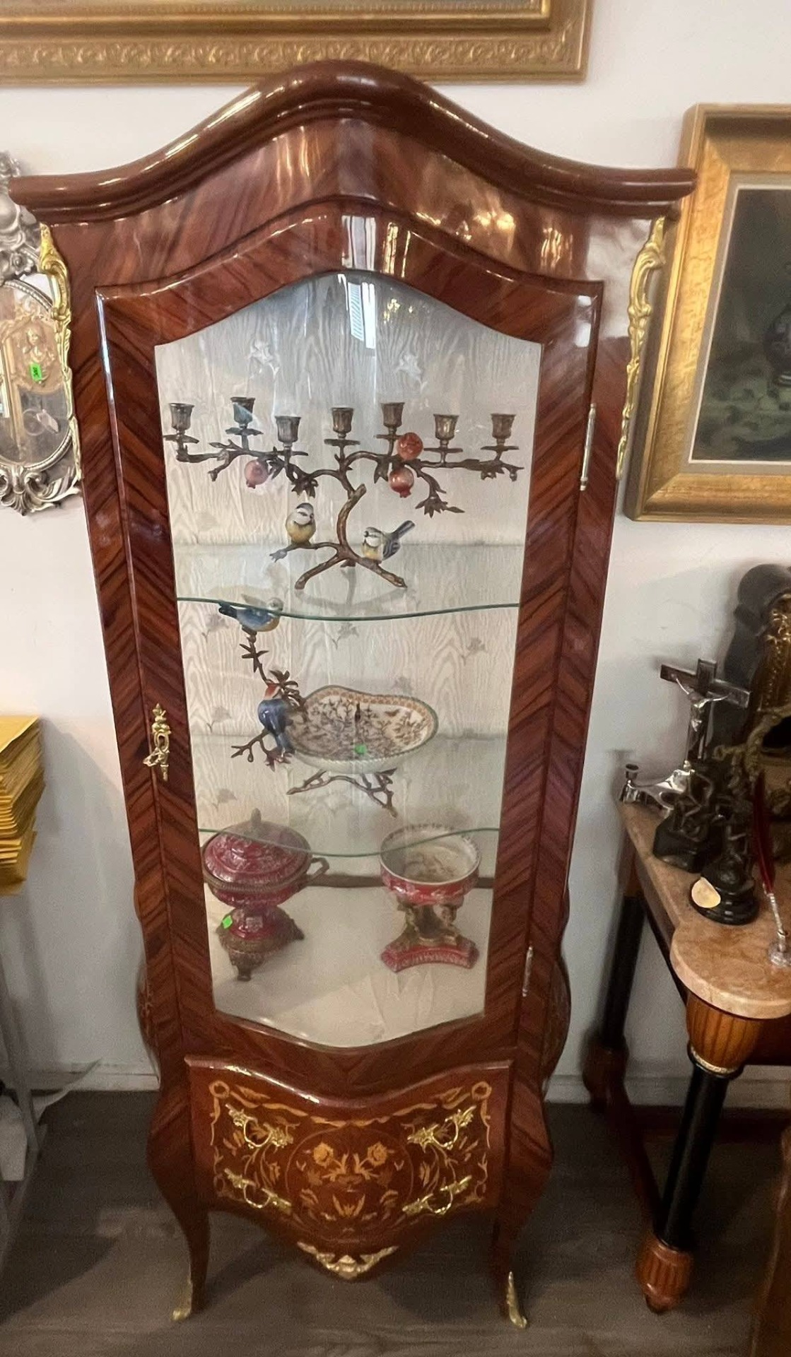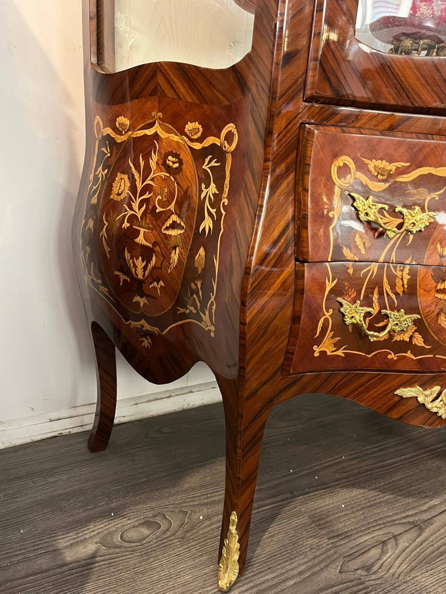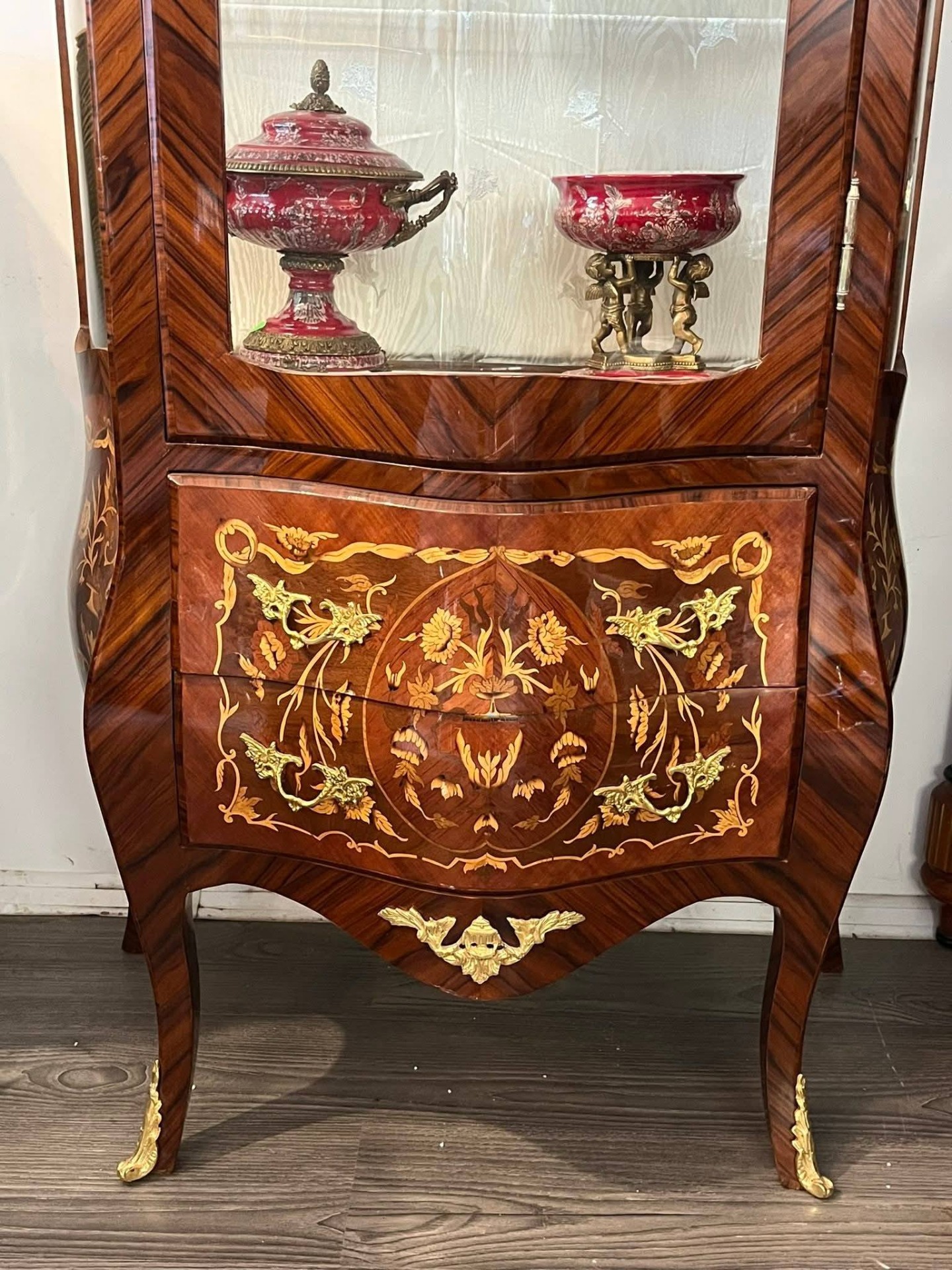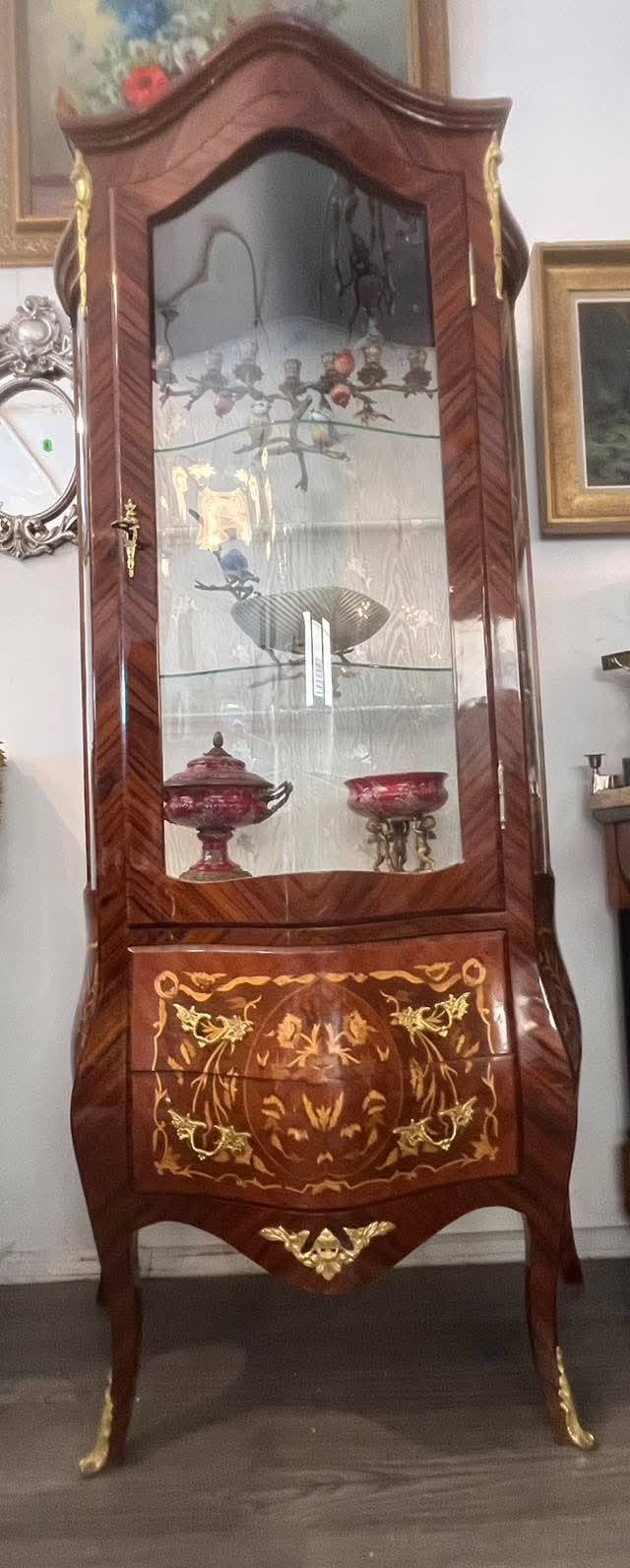 Vitrină deosebită, realizată în stil francez clasic (Louis XV / Belle Époque), din lemn masiv cu furnir bogat și marchetărie florală spectaculoasă, executată cu mare atenție la detalii. Piesa este decorată cu aplicații din bronz (ornamente, mânere, picioare), care îi conferă un aer nobil și rafinat.