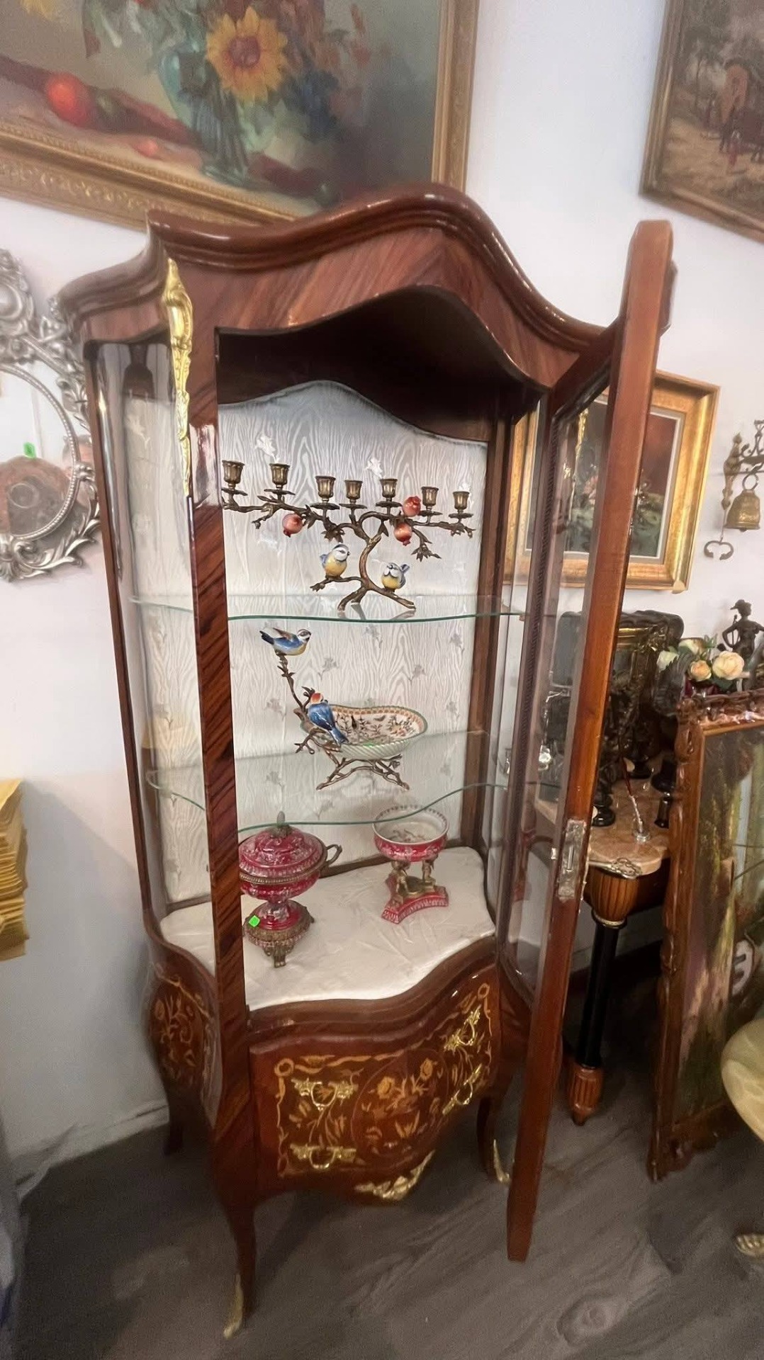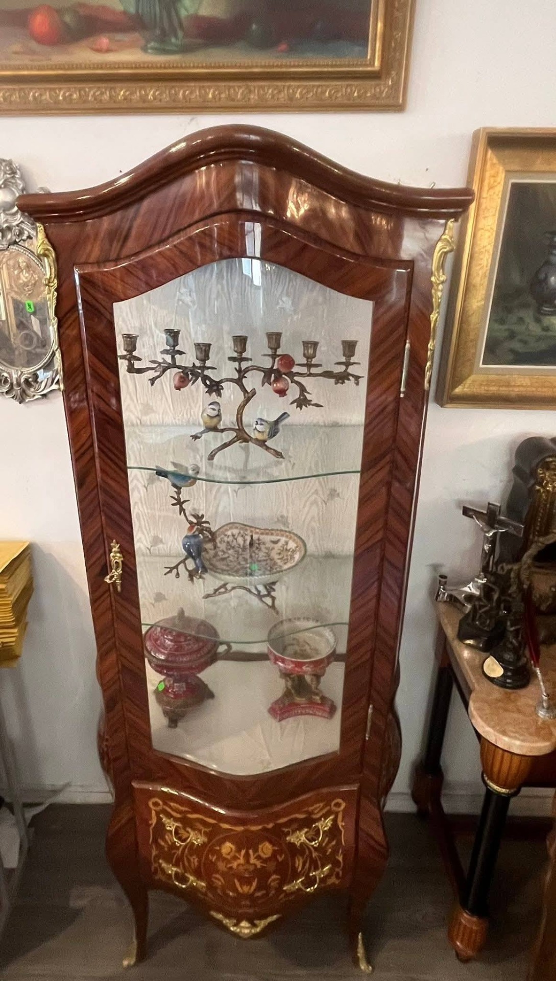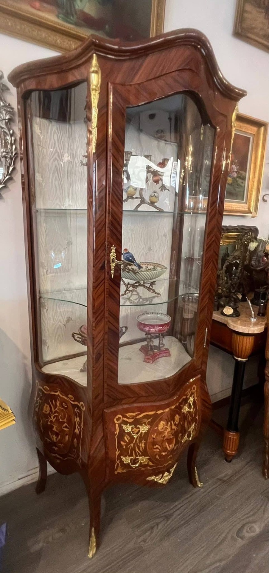 Vitrină deosebită, realizată în stil francez clasic (Louis XV / Belle Époque), din lemn masiv cu furnir bogat și marchetărie florală spectaculoasă, executată cu mare atenție la detalii. Piesa este decorată cu aplicații din bronz (ornamente, mânere, picioare), care îi conferă un aer nobil și rafinat.