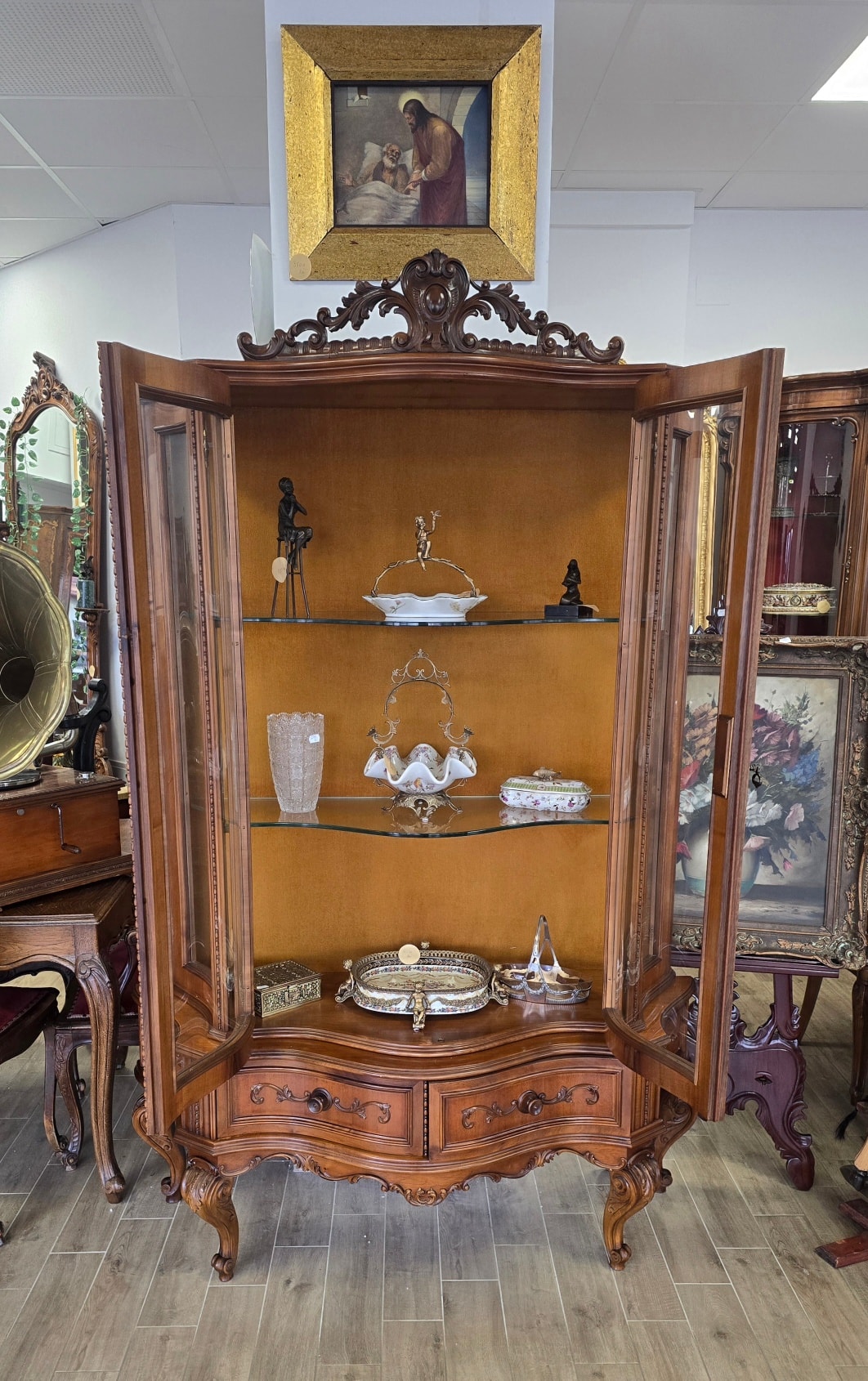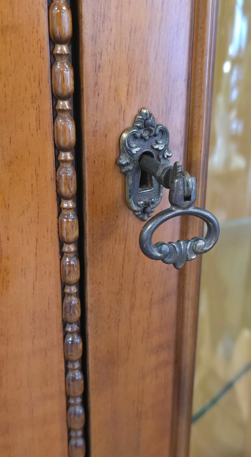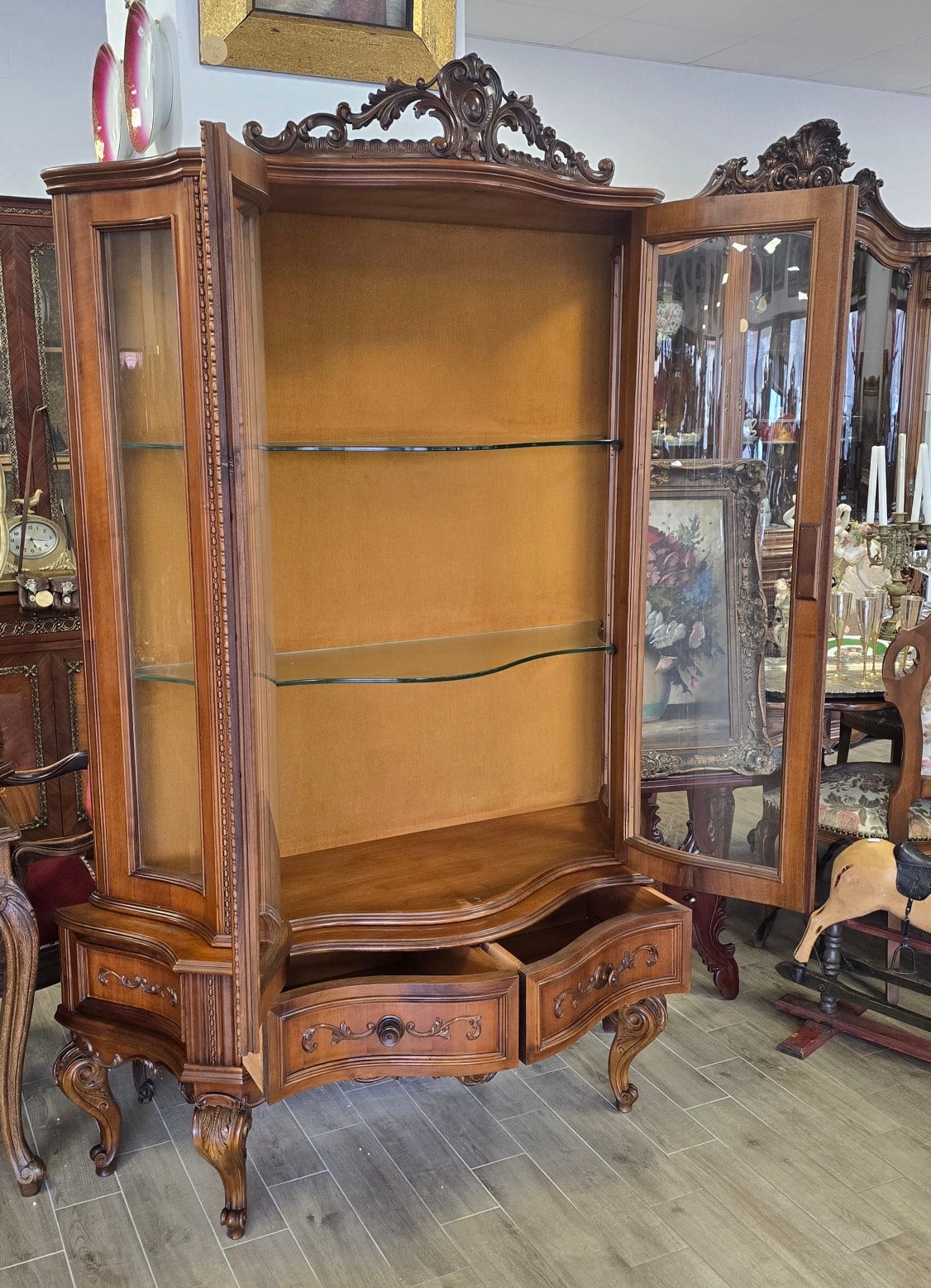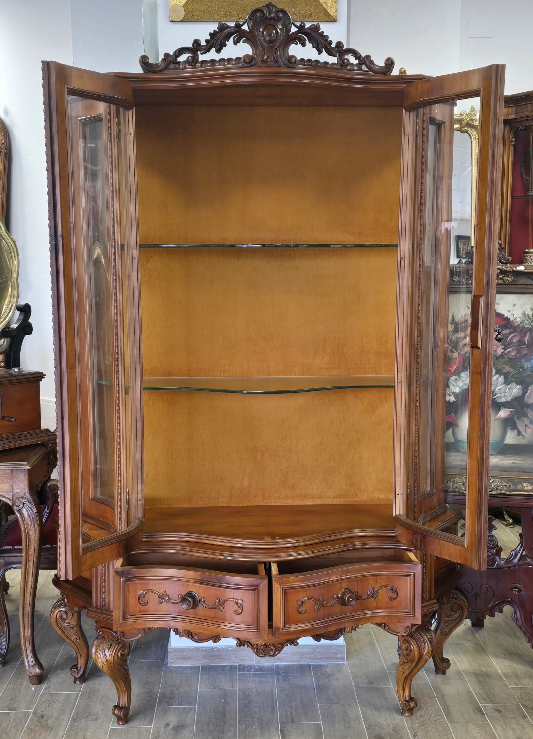 Vitrină veche în stil Neo-Baroc cu influențe Chippendale, cu linii curbe elegante și fronton sculptat manual cu motive vegetale, cu ușil și lateralele prevăzute cu sticlă ondulată, un detaliu rar și valoros care oferă o vizibilitate panoramică, interior cu polițe din sticlă, picioare sculptate stil "cabriole", ornamente perlate pe canturi și feronerie originală (cheie decorativă).