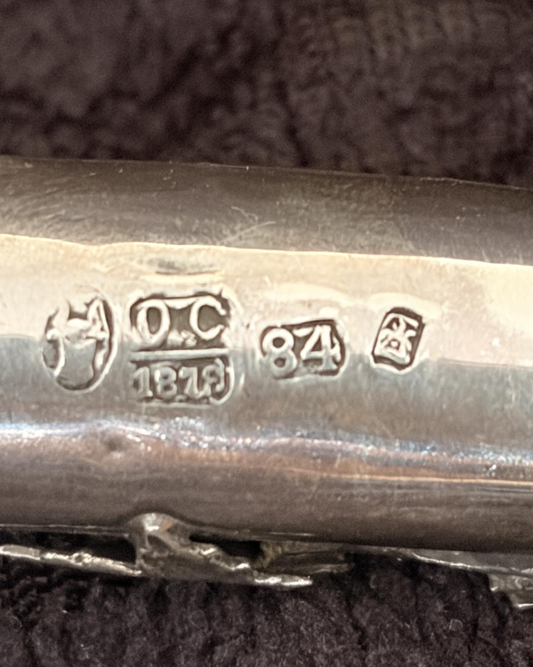 O.C" (în chirilică О.С) corespunde cel mai probabil lui Oscar Smidt (sau Alexander Smirnov, depinde de oraș), activ în acea perioadă. Anul fabricării este clar: 1878.