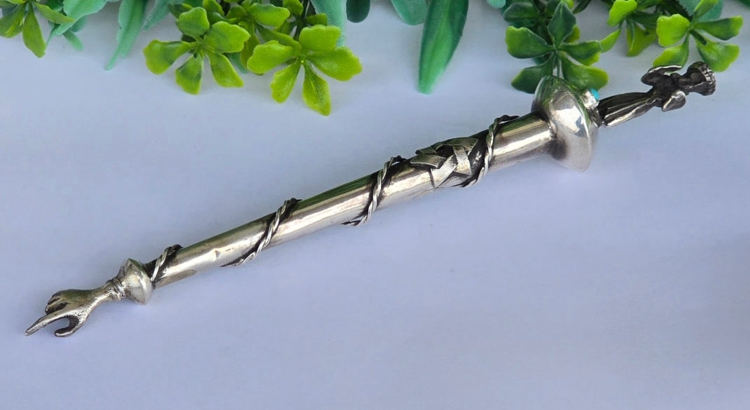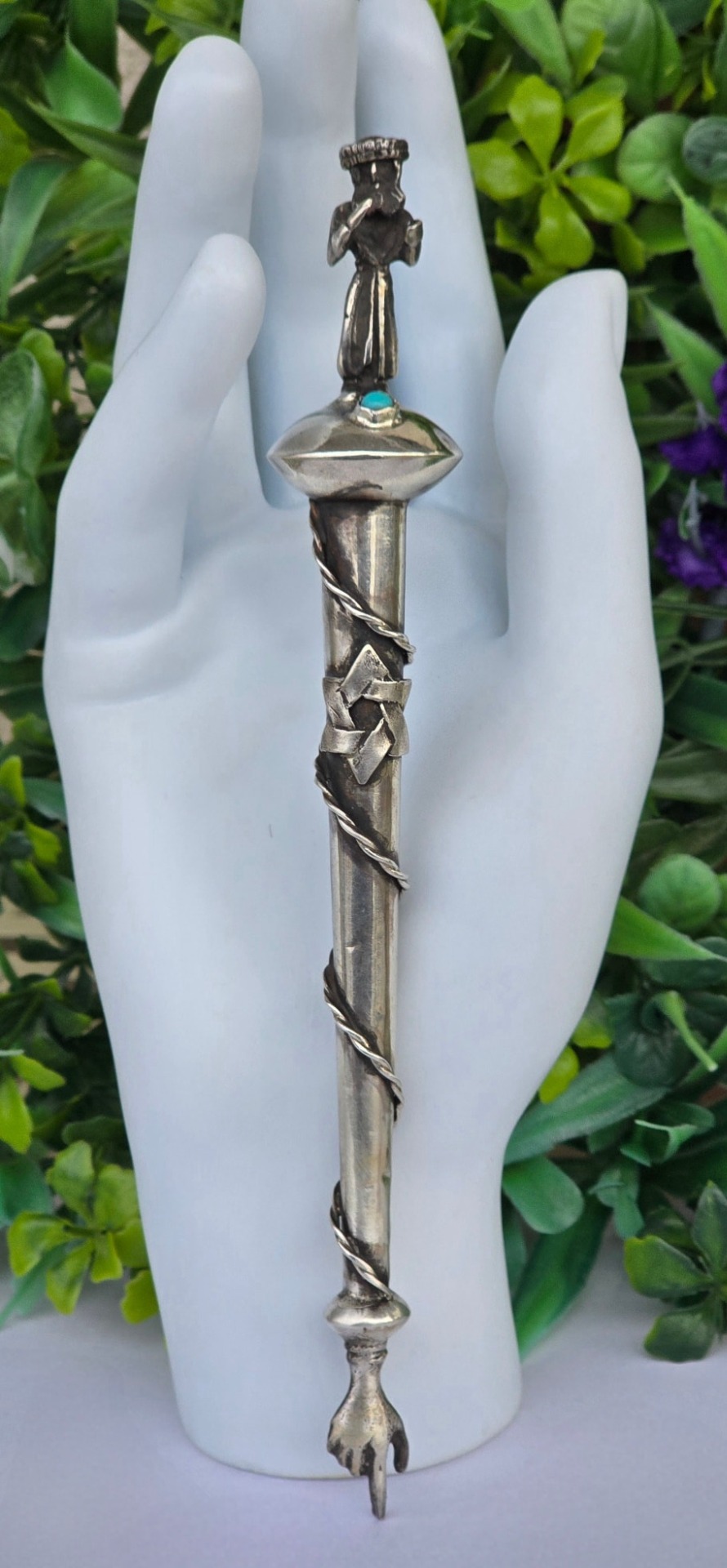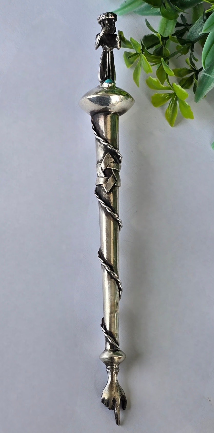 în vârf este decorat cu o fiigurină detaliată reprezentându-l pe Moise ținând Tablele Legii, cu piatră de turcoaz montată la baza figurinei, decorat cu motiv spiralat (torsadat) și cu Steaua lui David (Magen David) aplicată central, iar la capăt se află mâna cu degetul arătător întins (Yad), specifică acestui tip de obiect.