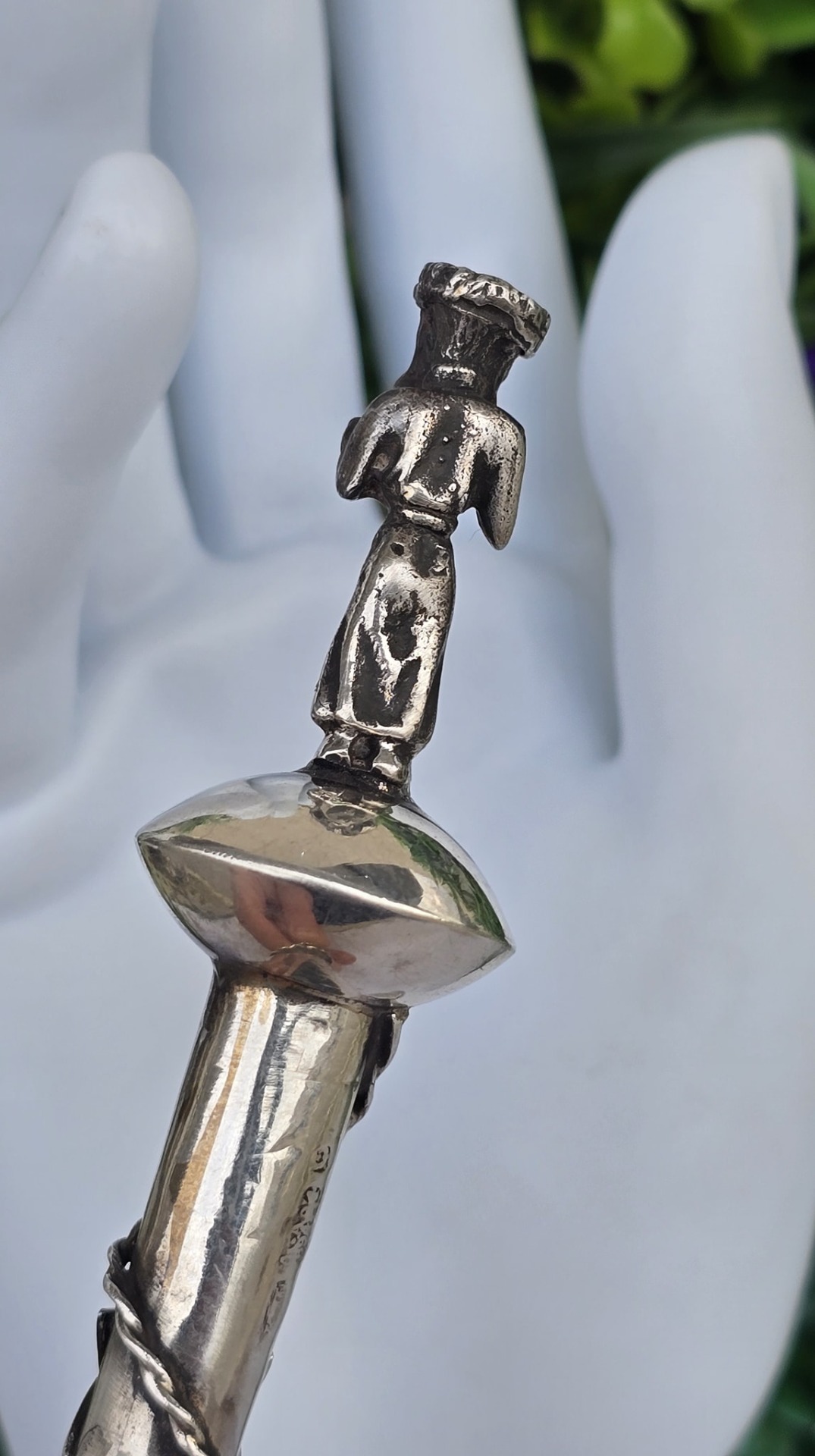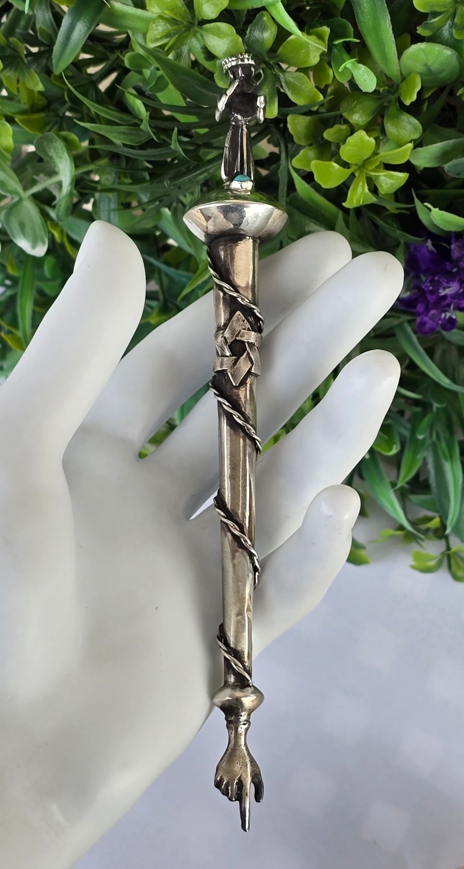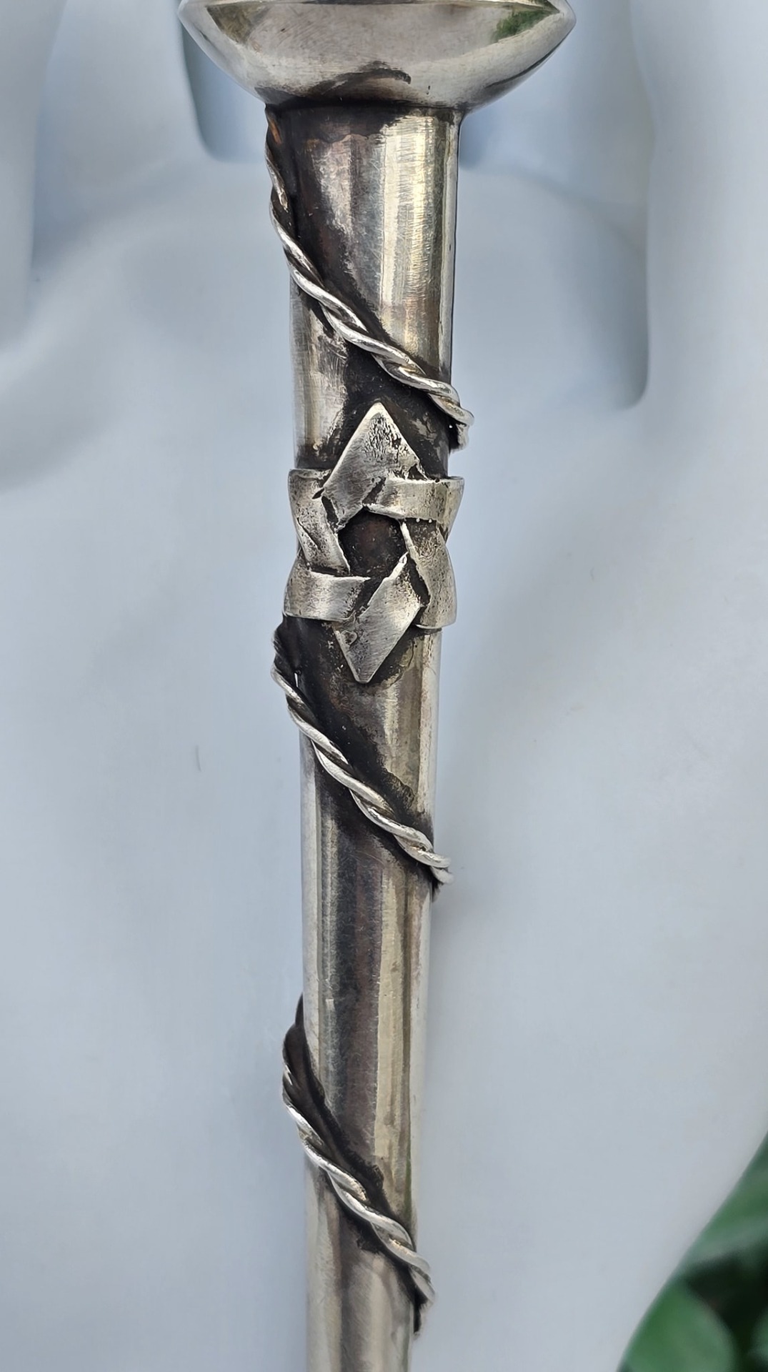 în vârf este decorat cu o fiigurină detaliată reprezentându-l pe Moise ținând Tablele Legii, cu piatră de turcoaz montată la baza figurinei, decorat cu motiv spiralat (torsadat) și cu Steaua lui David (Magen David) aplicată central, iar la capăt se află mâna cu degetul arătător întins (Yad), specifică acestui tip de obiect.