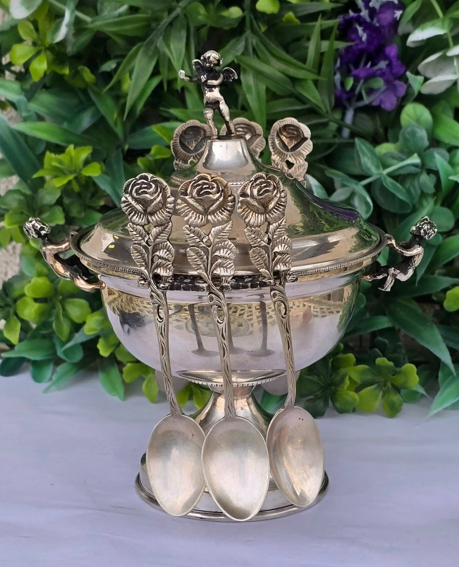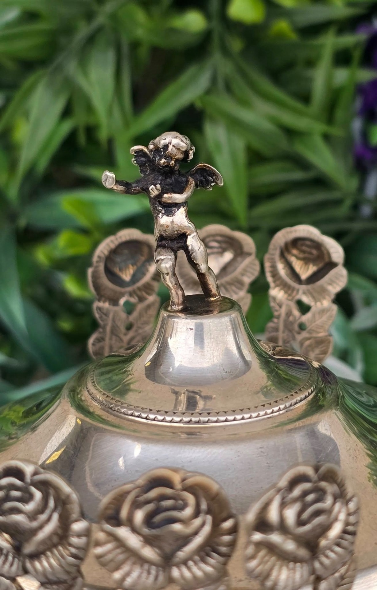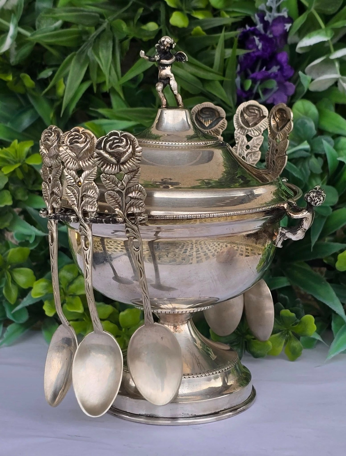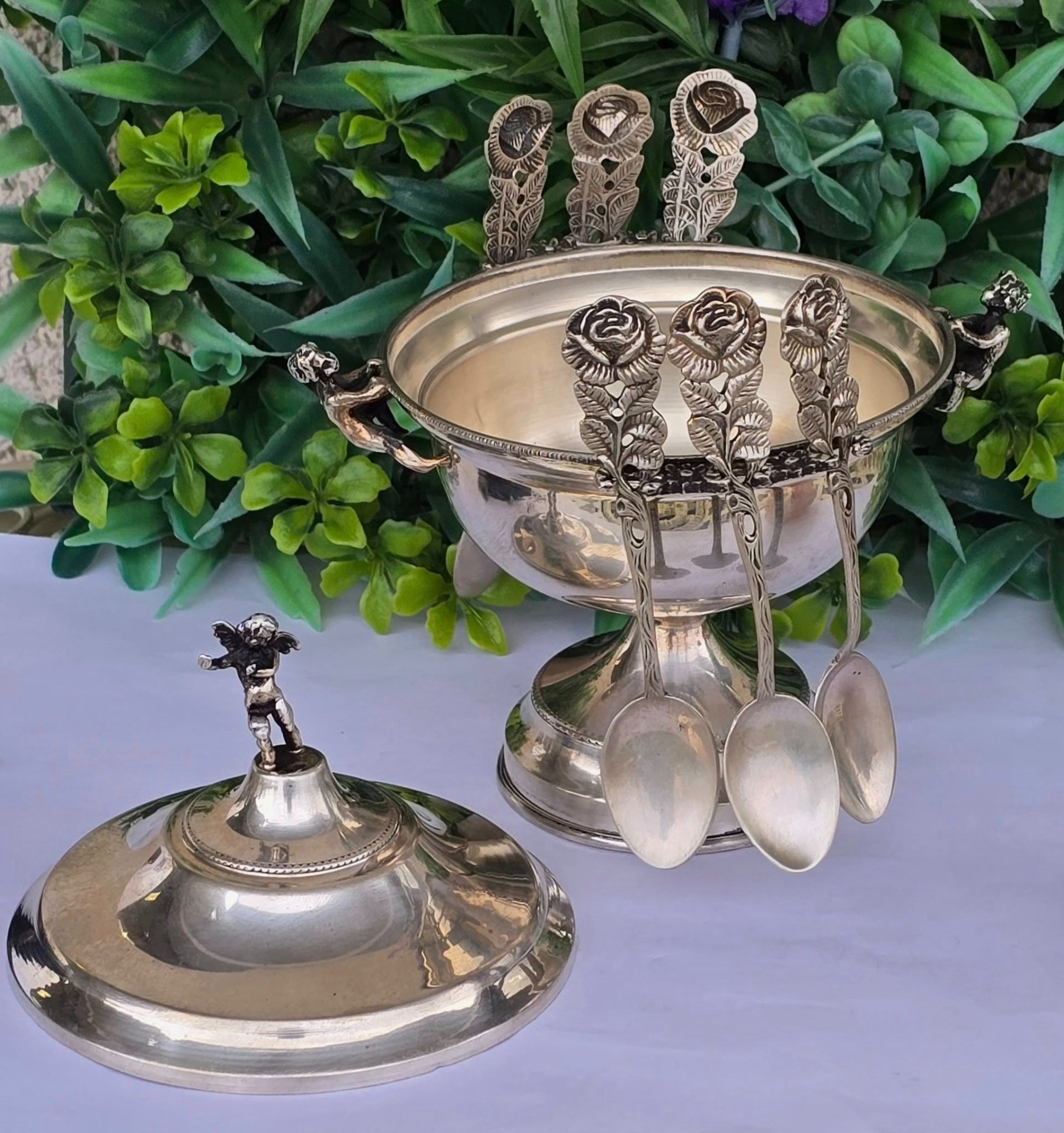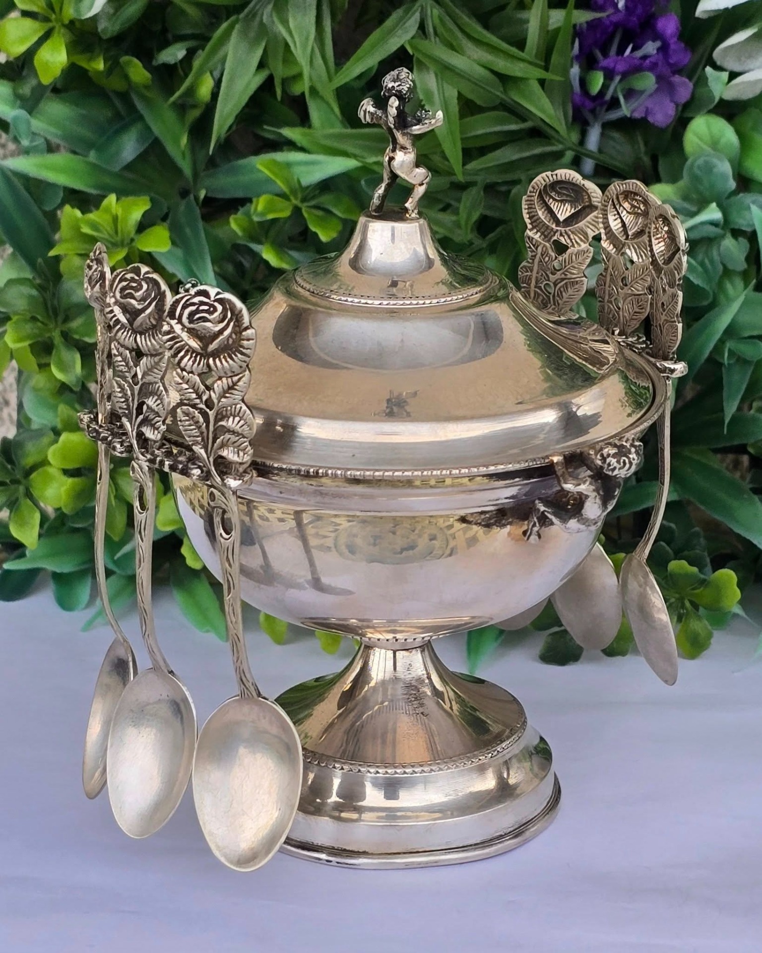Zaharniță veche din argint, cu capac, frumos stilizată cu amorași, cu 6 lingurițe din argint, frumos lucrate în motiv floral (anii 1940-1950, Florența, Italia).