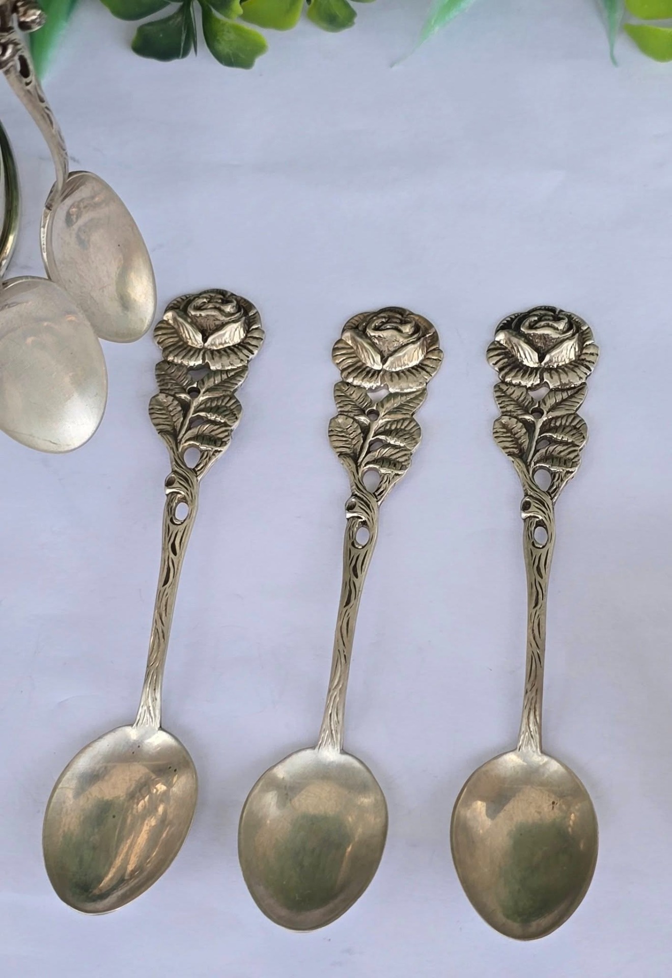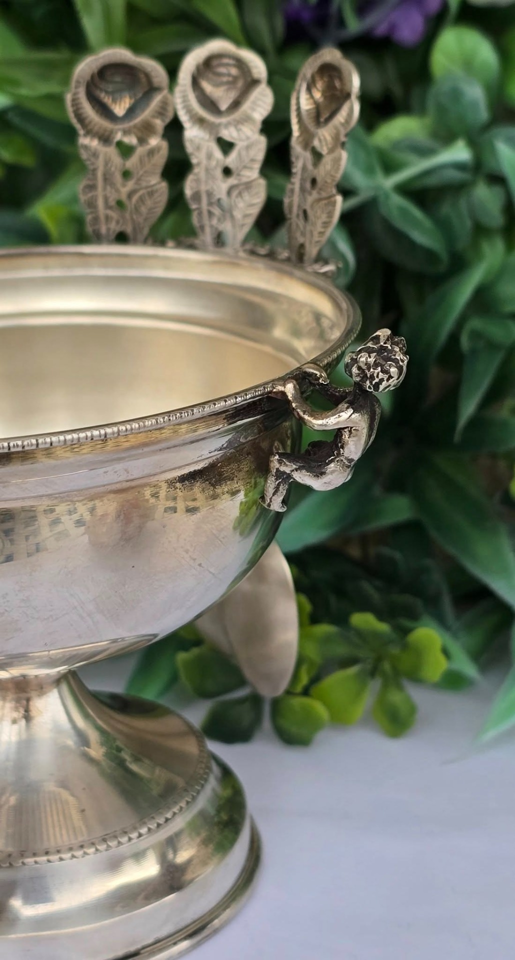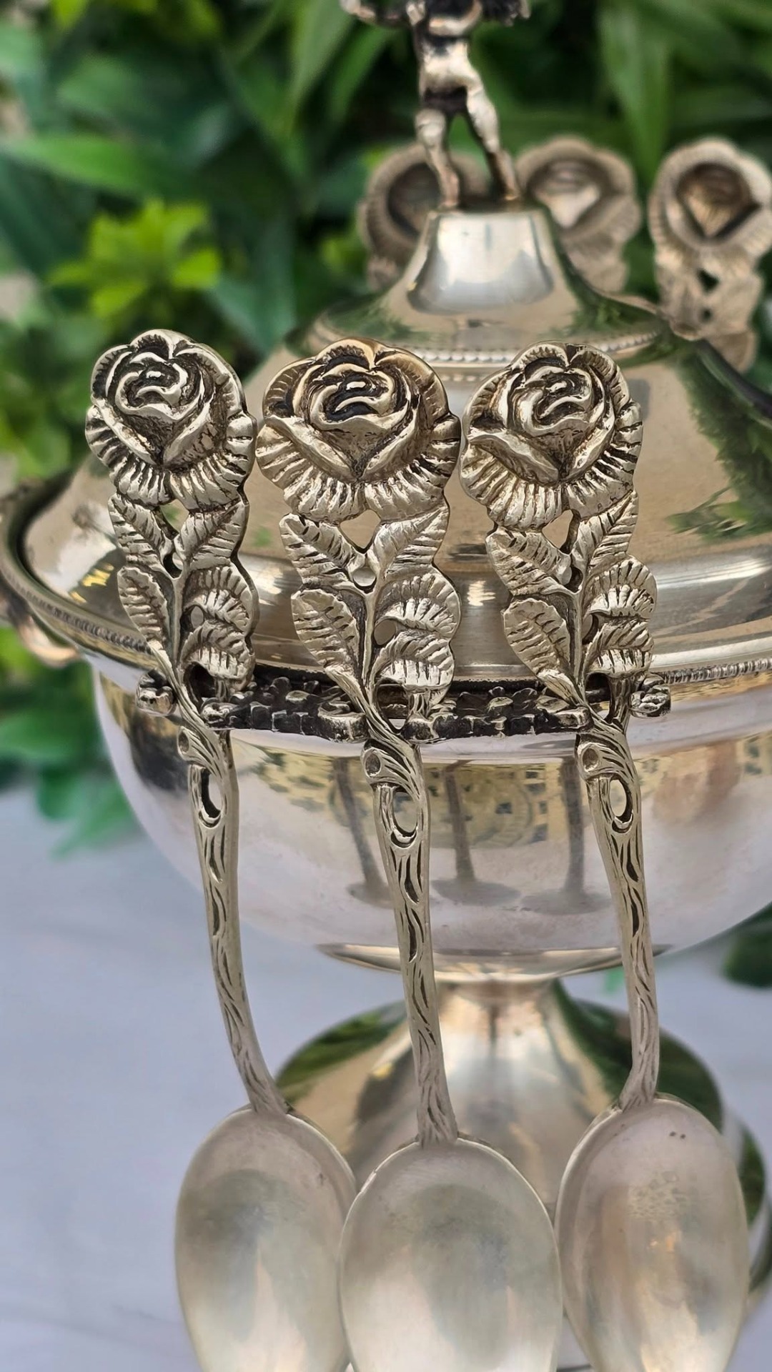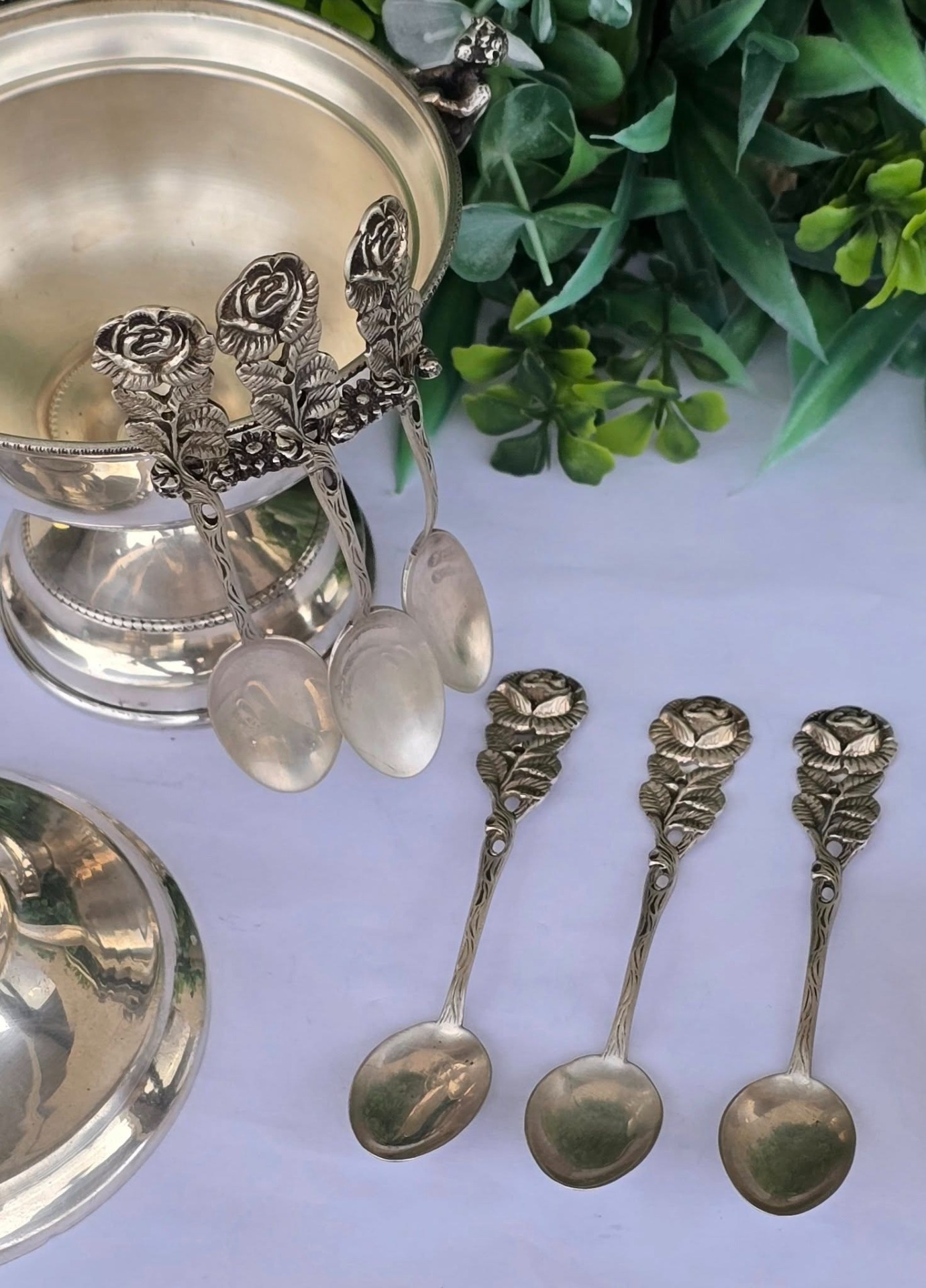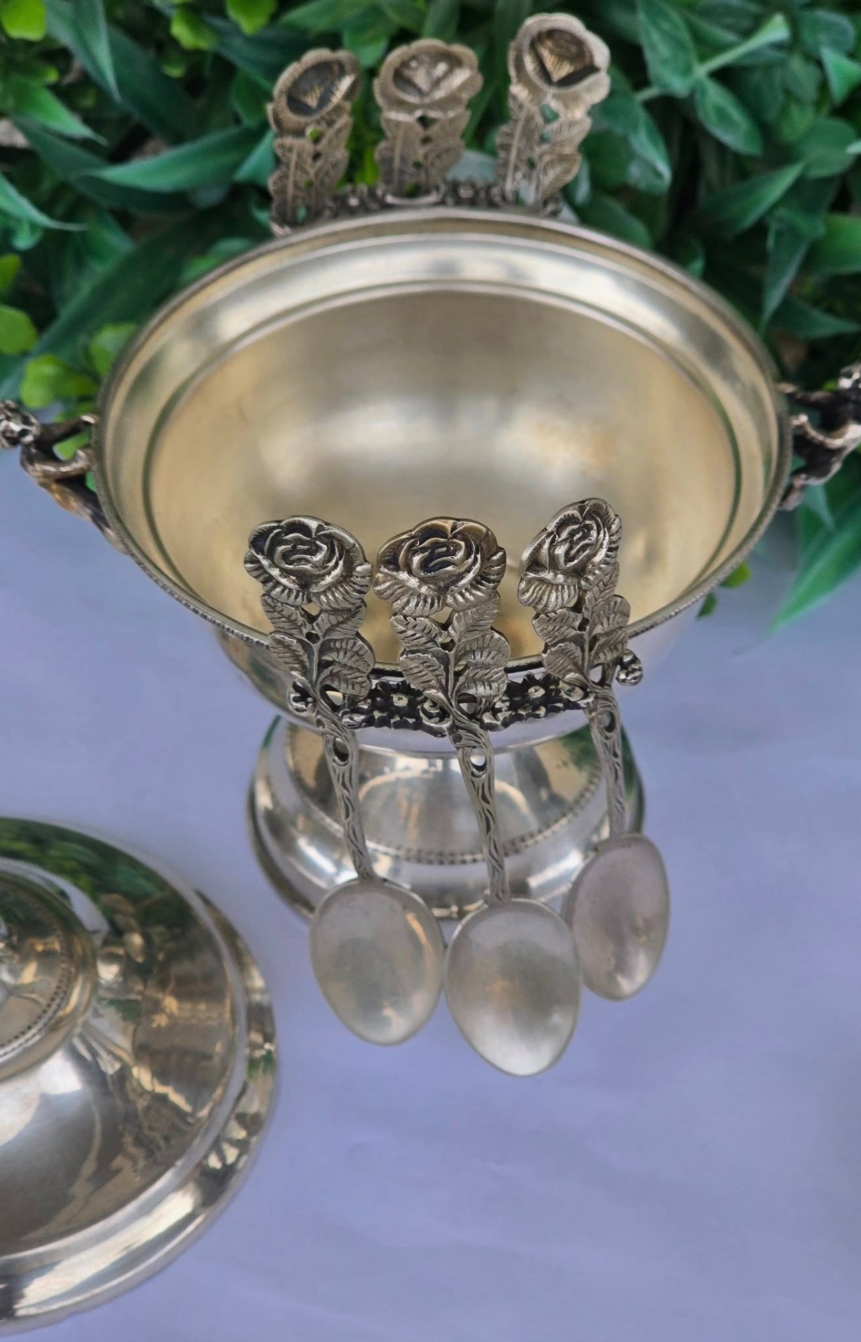 Zaharniță veche din argint, cu capac, frumos stilizată cu amorași, cu 6 lingurițe din argint, frumos lucrate în motiv floral (anii 1940-1950, Florența, Italia).