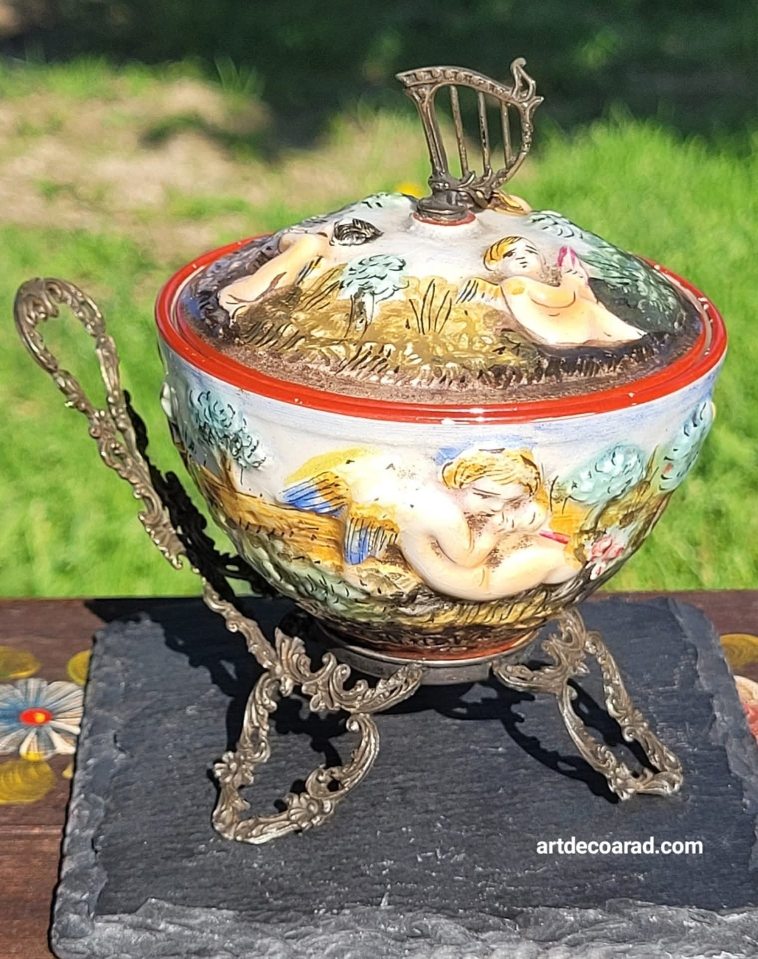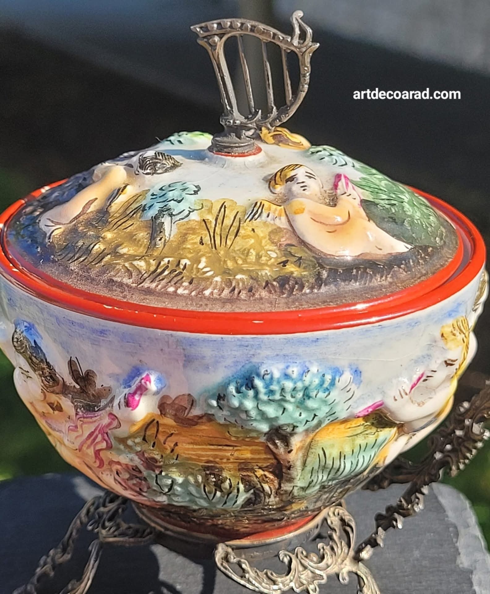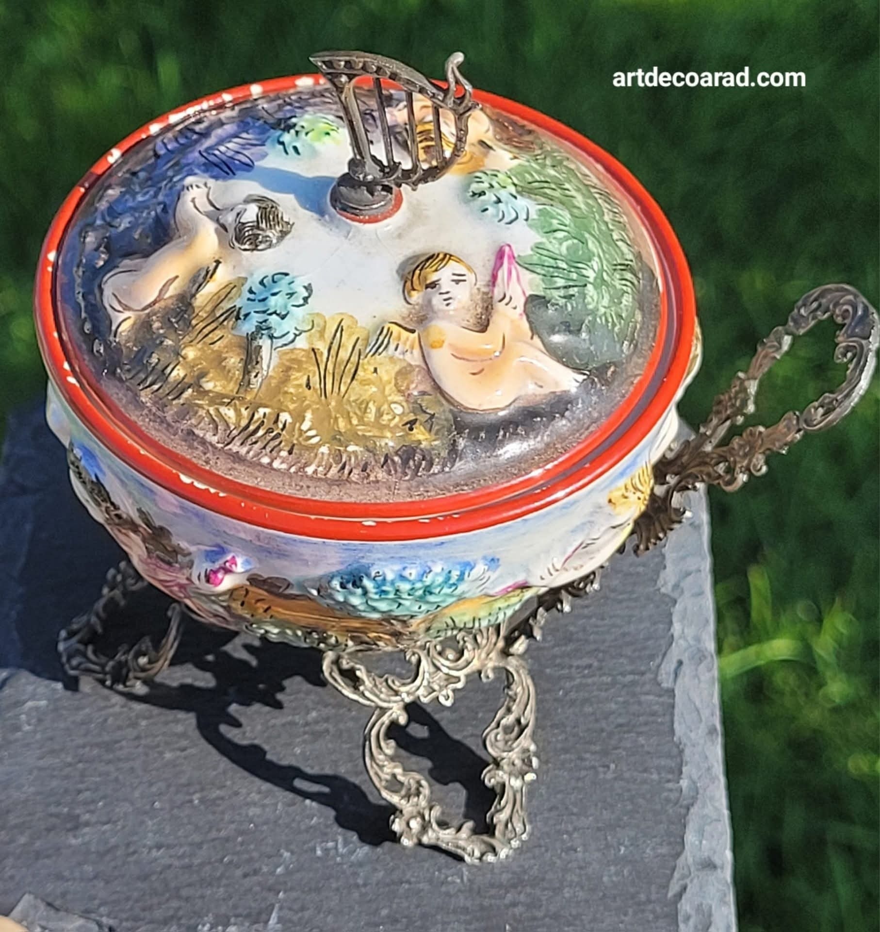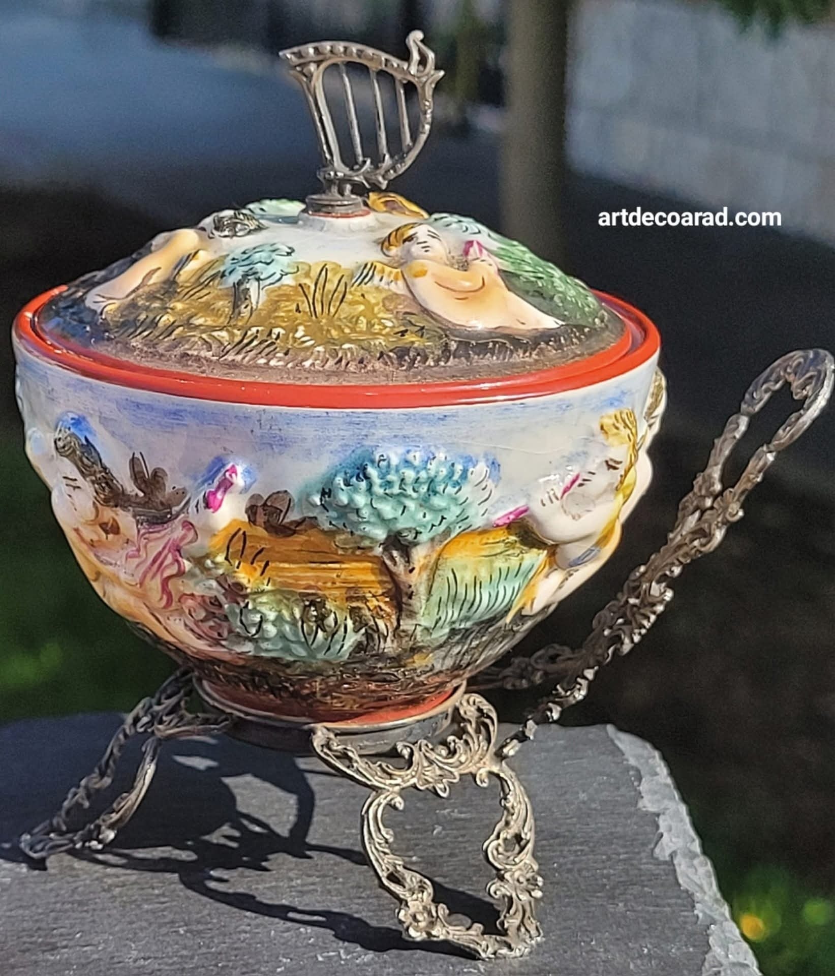 Zaharniță vintage din porțelan Capodimonte, în relief, pictat manual, în montură din argint (cca 1920, Italia).
