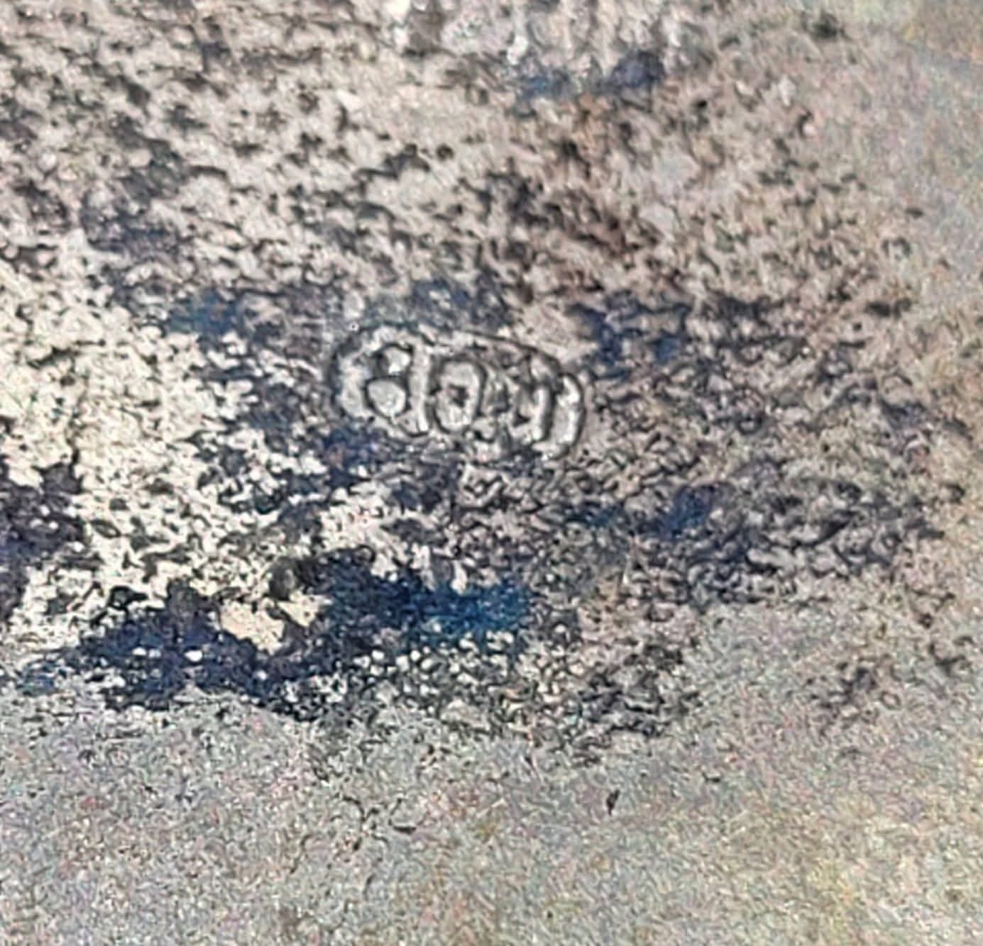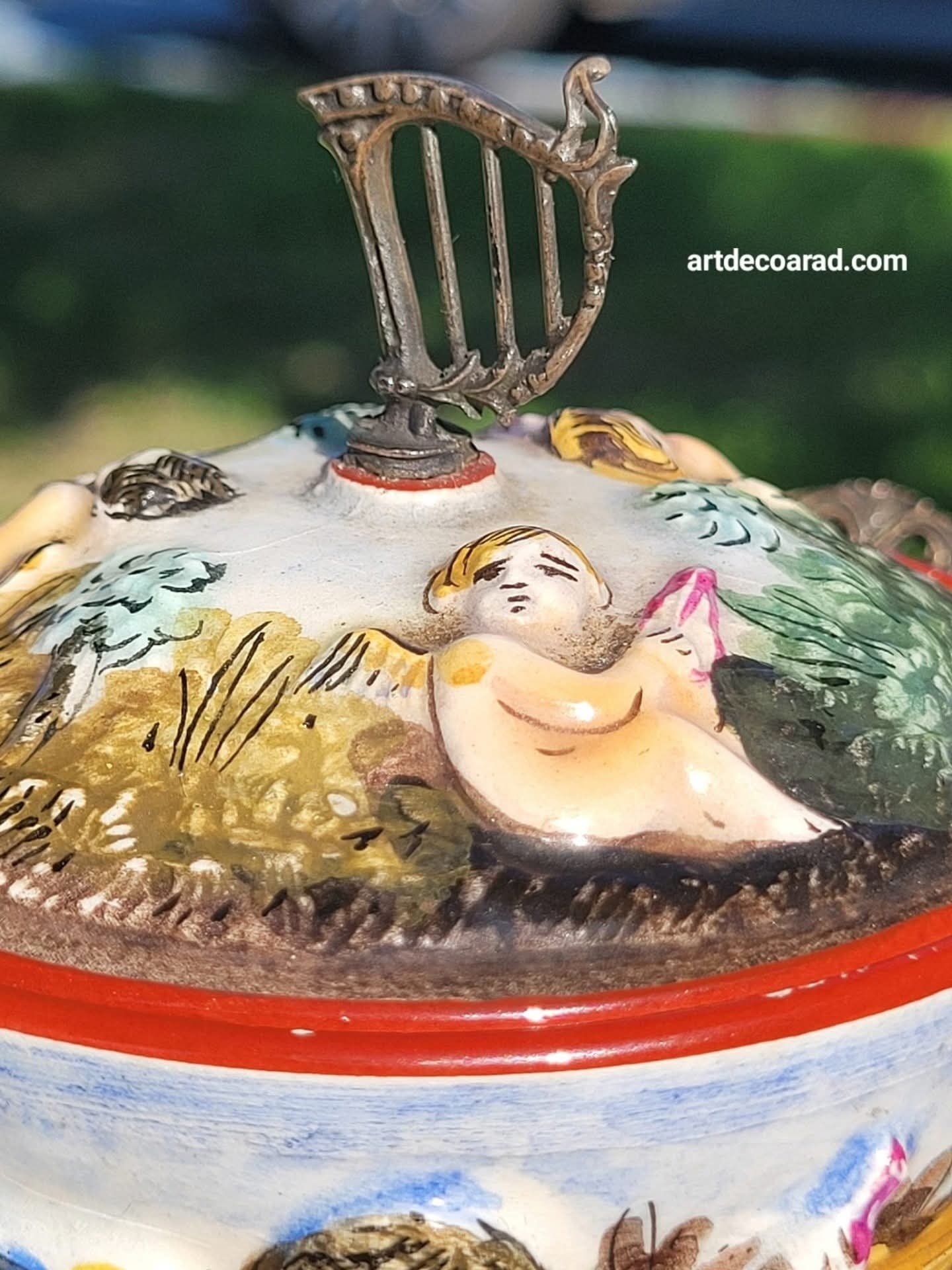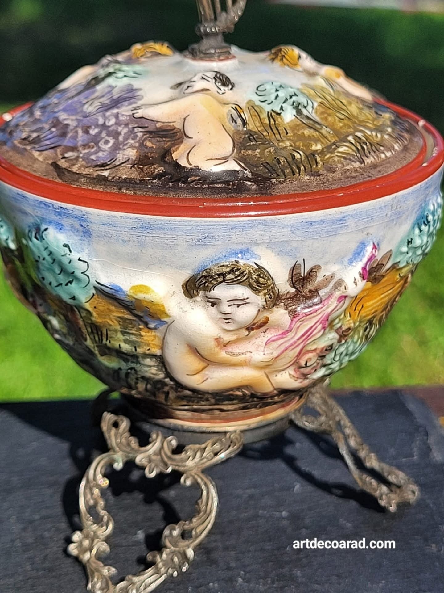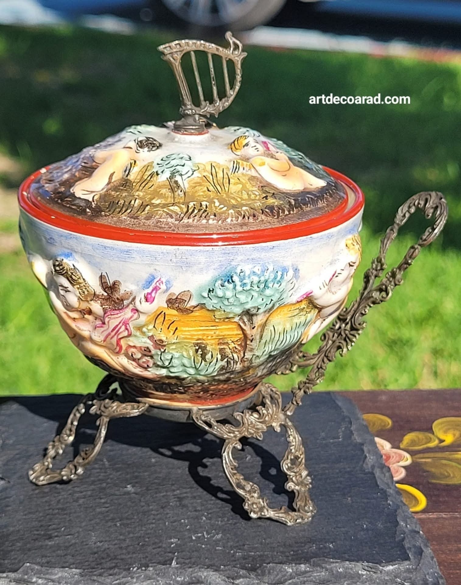 Zaharniță vintage din porțelan Capodimonte, în relief, pictat manual, în montură din argint (cca 1920, Italia).