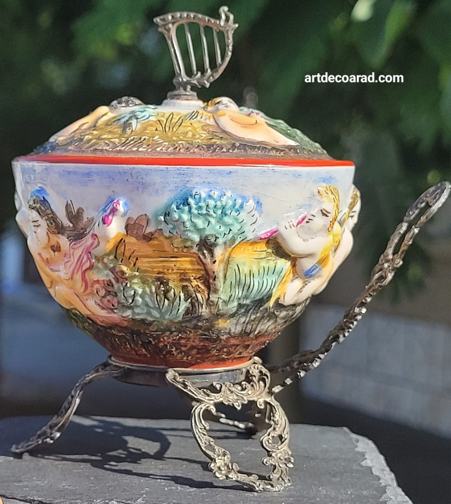 Zaharniță vintage din porțelan Capodimonte, în relief, pictat manual, în montură din argint,